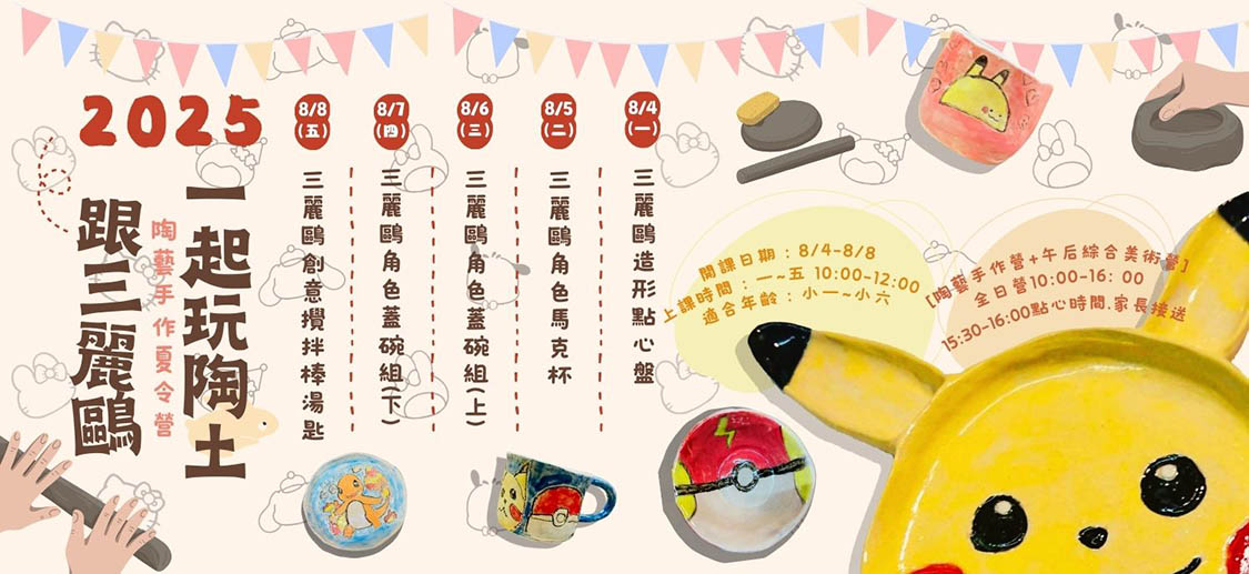 2025【跟三麗鷗一起玩陶土】陶藝手作夏令營 最新消息arttruth03/30/2023開課資訊 日期:114/8/4-8/8 適合對象:小一至小六 上課時間:10:00-12:00 時數:5堂10…詳細資料